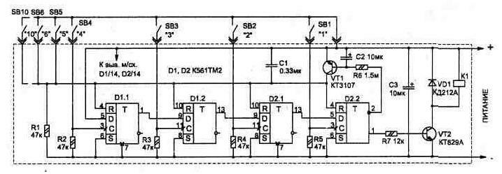 Предлагаемая схема может найти применение в любых устройствах, где требуется ограничить доступ посторонних к переключению режимов. В зависимости от того, что подключено на выходе схемы (электромагнит, реле, сигнализация и т. д.), назначение может быть самым разным, например отключение режима охранной сигнализации. В простейшем варианте, совместно с электромагнитом, схема может быть использована в качестве кодового замка. Его открывание производится набором известного ограниченному кругу лиц кода. Код состоит из 4 цифр (из 10 возможных). Кнопки с определенными цифрами необходимо нажать в заданной последовательности. Это позволяет иметь не менее 5040 возможных вариантов кода. Код легко и оперативно можно сменить, переставив зажимы проводов с кнопками в любой последовательности. При установке кода нежелательно занимать цифры последовательного ряда (1, 2, 3, 4). Лучше, если код будет состоять из цифр вразброс, например: 9, 3, 5, 0. Схема кодового устройства (рис. 1.38) собрана на двух микросхемах КМОП серии 561 ТМ2 (возможна замена на 564ТМ2). что обеспечивает высокую надежность и экономичность работы. Потребление схемой микротока позволяет легко выполнить, при необходимости, автономное питание. По дойдет любой, даже не стабилизированный источник постоянного напряжения 4...15 В. Работает электрическая схема следующим образом. В начальный момент, при подаче питания, цепь из конденсатора С1 и резистора R1 формирует импульс обнуления триггеров (на выходах 1 и 13 микросхем будет лог. "0"). Рис. 1.38 При нажатии на кнопку первой цифры кода (на схеме — SB4), в момент ее отпускания триггер D1.1 переключится, т. е. на выходе D1/1 появится лог. "1", так как на входе D1/5 есть лог. "1". При нажатии очередной кнопки, если на входе D соответствующего триггера имеется лог. "1", т. е. предыдущий сработал, то лог. "1" появится и на его выходе. Последним срабатывает триггер D2.2 , а чтобы схема не осталась в таком состоянии надолго, используется транзистор VT1. Он обеспечивает задержку обнуления триггеров. Задержка выполнена за счет цепи заряда конденсатора С2 через резистор R6. По этой причине на выходе D2/13 сигнал лог. "1" будет присутствовать не более 1 секунды. Этого времени вполне достаточно для срабатывания реле К1 или электромагнита. Время, при желании, легко можно сделать значительно больше, применив конденсатор С2 большей емкости. В процессе набора кода нажатие любой ошибочной цифры обнуляет все триггеры. Если сигнал управления транзистором VT1 снимать с выхода не последнего триггера (например с вывода D2/12), то будет ограничено необходимое время на нажатие цифр кода. В этом случае даже при правильном, но медленном наборе кода выходной сигнал не появится. Размещается схема вблизи кнопочной панели. Все используемые детали, за исключением транзистора VT2, могут быть любого типа. Транзистор VT2 применен с большим коэффициентом усиления, и в случае использования в качестве нагрузки вместо реле электромагнита его нужно заменить на более мощный из серии КТ827. Для открывания защелки дверного замка лучше использовать