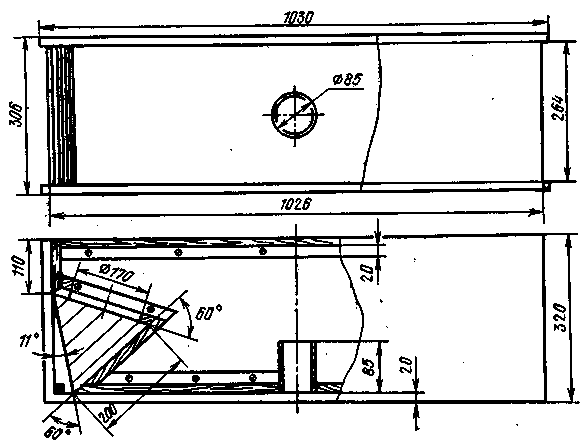 На рис.1,а схематично изображено размещение головок в обычном моноблочном громкоговорителе консольной радиолы. База системы, определяемая расстоянием между фазовыми центрами излучений головок левого и правого каналов, обозначенных двумя звездочками, несколько меньше длины громкоговорителя. При таком расположении головок основное направление излучения на частотах сигнала совпадает с направлением на слушателя. Для получения базы не менее 1,5 м длина корпуса должна быть около 2 м. Если же сократить этот размер до 1 м, то стереоэффект будет проявляться только в непосредственной близости от громкоговорителя, на расстоянии около 1 м. Это уже неудобно. База может быть расширена, если головки поместить на боковых стенках корпуса громкоговорителя, как показано на рис.1,б. Но при этом основное направление излучения на средник и особенно на высших частотах будет ориентировано перпендикулярно направлению на слушателя. Очевидно, что звук, обедненный средними и высшими частотами, не может доставить слушателю большого удовольствия. Для увеличения базы моноблочного стереофонического громкоговорителя, с одной стораны, и сохранения достаточно мощного излучения на средних и высших частотах в сторону слушателя, с другой, необходимо разместить головки левого и правого каналов в торцевых стенках и частично развернуть их в горизонтальной плоскости на определенный угол в сторону слушателя. В большинстве случаев именно так и поступают многие конструкторы. Различаются такие громкоговорители лишь углами поворота головок и геометрическими размерами корпуса. Но на рис.1,в приведен продольный разрез моноблочного стереофонического громкоговорителя, в котором кроме поворота головок введено усовершенствование, значительно расширяющее базу при одновременном сохранении направленности излучения в сторону слушателя в широкой полосе частот. Суть новшества заключается в том, что перед диффузорами головок помещают акустические волноводы - металлические пластины, изменяющие направление распространения звука, воспроизводимого головками, в сторану от слушателя. Таким образом, здесь оказывается влияние двух факторов. Во-первых, поворот головки в сторону слушателя улучшает диаграмму направленности излучения в сторону слушателя. Во-вторых, отклонение звука в сторону от слушателя увеличивает базу системы. При вполне определенном соотношении углов поворота головок и направленности акустических волноводов удается достичь расширения базы и сохранения требуемой направленности звучания. В данном громкоговорителе при длине корпуса громкоговорителя 750 мм можно получить баэу около 1,5 м. На рис.2 приведены эскизы общего вида лицевой панели и внутреннего вида любительского громкоговорителя, в котором реализован описанный выше принцип построения моноблочного стереофонического громкоговорителя. Установка двух головок различных каналов в одном корпусе создает условия для улучшения акустической отдачи на нижних частотах как за счет возникновения эффекта группового излучателя, так и за счет принятия дополнительных мер- использования фазоинвертора с трубой, показанной на рис.2. Труба из картона диаметрам и длиной 86 мм улучшает равномерность амплитудно-частотной характеристики установки в области нижних частот, расширяет полосу пропускания.