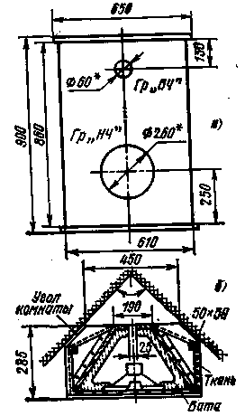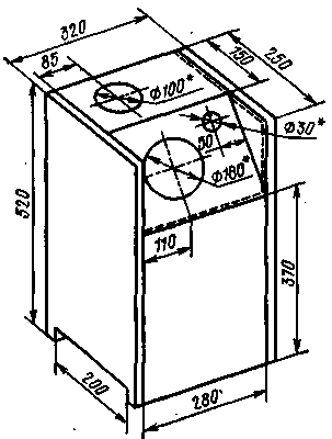 Если комната узкая, то можно направить основное излучение громкоговорителей в сторону боковых стен. За счет переотражения и переизлучения от стен удается получить эффект расширенной стереобазы (рис.5,в,г). В помещении больших размеров, когда громкоговорители расставлены относительно далеко друг от друга, можно создать эффект сближения их, для чего необходимо направить основное излучение громкоговорителей навстречу друг другу (рис.5,д,е). При повторении конструкции рекомендуется использовать для каждого экземпляра громкоговорителя по две головки типа 4ГД-4 или 4ГД-35 для низкочастотного тракта и две головки для высокочастотного. При этом номинальная мощность сигнала, подводимая к громкоговорителю, может достигать 8 Вт. При использовании головок типа 4ГД-36, паспортная мощность которых равна 8 Вт, допускаются кратковременные перегрузки до 16 Вт. Конечно, диаметр вырезов в панелях необходимо согласовать с размерами диффузодержателей отечественных головок. Следует заметить, что в последние годы появилось большое число любительских и профессиональных громкоговорителей, широкополосных и многополосных, в которых большая или меньшая часть излучения направляется в сторону стен помещения. В громкоговорителе, о котором шла речь, на боковое излучение отводится в среднем около половины подводимой мощности. Известны конструкции радиолюбителей, где из девяти однотипных широкополосных головок излучает во фронт только ... одна. Остальные восемь имеют основное излучение, направленное в тыл, в сторону стены помещения, т. е. на излучение в сторону слушателя расходуется только 11% мощности, подводимой к громкоговорителю. Правда, остальные 89% излучаемой мощности не пропадают бесследно. Излучение вбок и назад, отражаясь от стен и пола, частично доходит до слушателя в виде рассеянного отраженного сигнала, восприятие которого создает иллюзию нахождения в просторном концертном зале. Меняя положение таких громкоговорителей относительно стен и пола, разворачивая их некоторым образом в горизонтальной плоскости относительно слушателя, можно добиваться наилучшего для данного помещения звучания электроакустической аппаратуры. Трехполосный громкоговоритель. О трехполосных громкоговорителях уже много говорилось ранее. На рис.6 приведен эскиз конструкции трехполосного громкоговорителя. Корпус громкоговорителя изготовлен из древесно-стружеч-ной плиты толщиной около 20 мм. Дно у корпуса отсутствует. Между полом и боковыми стенками оставлена щель высотой около 25 мм и длиной 200 мм. Ее назначение - создание дополнительного синфазного излучения на нижних частотах воспроизводимого сигнала.