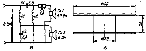 Первая особенность конструкции громкоговорителя - щелевое отверстие шириной 26 мм и длиной 860 мм, т. е. во всю длину задней стенки. Вторая особенность - призматическая форма корпуса: ширина лицевой панели 610мм, задней - 190 мм. Нижняя и верхняя стенки имеют форму прямоугольника размерами 285х650 мм с двумя усеченными углами. Это сделано для удобства размещения громкоговорителя на полу, в углу комнаты. Тем самым достигаются сразу две цели. Во-первых, громкоговоритель размещается в том месте комнаты, где он не мешает. Во-вторых, создается дополнительный подъем нижних частот на несколько децибелл за счет отражения сигнала от двух боковых стен и пола комнаты. Корпус громкоговорителя изготовляют из фанеры или древесно-стружечной плиты толщиной около 20 мм. Рейки для боковых распорок декоративного оформления тканью с поперечным сечением 90х50 мм - из сосны. Места соединения боковых стенок с верхней и нижней стенками укрепляют прямоугольными накладками с поперечным сечением 40х40 мм, изготовленными также из сооны. Для устранения влияния отражения сигнала на средних и высших частотах внутри корпуса размещают простеганный слой натуральной или минеральной ваты толщиной не менее 50 мм. Такое покрытие должно быть выполнено по всей внутренней поверхности корпуса. При повторении конструкции можно использовать низкочастотную головку типа 6ГД-'2 и высокочастотную головку типа 3ГД-31, подогнав размеры отверстий на передней панели с учетом размеров диффузоров отечественных головок. При таком сочетании головок громкоговоритель способен эффективно воспроизводить сигналы в полосе частот от 40 Гц до 16 кГц. Подводимая мощность широкополосного сигнала может достигать 6-8 Вт. Разделительный фильтр должен иметь частоту разделения около 3 кГц. На рис. 2,а приведена принципиальная схема разделительного фильтра для совместной работы с низкочастотной головкой сопротивлением 8 Ом и высокочастотной головкой сопротивлением 6,5 Ом. При этом резистор R1 необходим для выравнивания сопротивления нагрузки высоко- и низкочастотного выходов фильтра. Если использовать отечественную высокочастотную головку на 8 Ом, резистор R1 необходимо исключить.