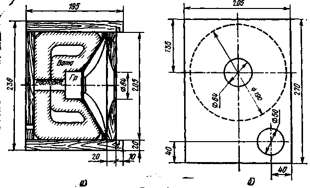 При изготовлении катушек можно применять картонные каркасы размерами, указанными на рис. 41,6. При этом катушка L1 должна содержать 100 витков, L2 - 120 витков провода марки ПЭВ-3 диаметром 0,9-1,1 мм. Требуемые емкости конденсаторов С1 и С2 можно получить, соединив параллельно несколько конденсаторов типа МБМ на 160 В с емкостями 1,0, 0,5 и 0,1 мкФ. Громкоговоритель с обратным экспоненциальным рупором. В настоящее время среди любителей и профессионалов большой популярностью пользуются так называемые малогабаритные акустические системы, сокращенно MAC. Небольшие по размерам, удобные в обращении, обладающие широкой полосой воспроизводимых частот, они получают все более широкое распространение. Правда, у них есть ряд недостатков. Самый существенный - относительно малая отдача во всей полосе частот. Для нормальной работы таких громкоговорителей требуется подводимая мощность около 10 Вт или более, тогда как для громкоговорителей обычного типа - в 2-3 раза меньше. Этот недостаток в какой-то мере компенсируется возросшей мощностью современных усилителей низкой частоты. У громкоговорителей MAC есть еще один недостаток, обусловленный специфическими нелинейными искажениями, создаваемыми диффузором. Дело в том, что в таких громкоговорителях применяют специальные низкочастотные головки с очень легкой подвеской диффузора. За счет этого собственная резонансная частота головок очень низка и достигает 10-16 Гц. При установке головки в корпус с хорошей герметизацией резонансная частота ее увеличивается в 2-3 раза, достигая требуемого для высококачественного воспроизведения звука значения, равного 20-45 Гц. Демпфирование диффузоров таких головок происходит за счет упругости воздуха, заключенного во внутреннем объеме корпуса громкоговорителя. При этом диффузор работает подобно поршню компрессора, попеременно сжимая и расширяя воздух внутри корпуса. По этой причине низкочастотные головки с легкой подвеской называют компрессионными или головками с воздушной подвеской диффузора. Причина дополнительных нелинейных искажений, создаваемых низкочастотными головками MAC, заключается в том, что передняя и задняя поверхности диффузора этих головок имеют различные акустические сопротивления. Передняя поверхность соприкасается с открытым пространством, а задняя поверхность - с воздухом, замкнутым в герметизированном корпусе громкоговорителя. Очевидно, что для устранения дополнительных специфических нелинейных искажений низкочастотных головок необходимо сравнять или хотя бы сблизить акустические сопротивления обеих поверхностей диффузора. В одном из журналов было опубликовано краткое описание двухполосного малогабаритного громкоговорителя, в котором значительно ослаблены нелинейные искажения указанного типа. При внешних размерах 196х236х300 мм и массе 4,9 кг громкоговоритель обеспечивает эффективное воспроизведение звука в полосе частот от 60 Гц до 16 кГц при номинальной подводимой мощности 10 Вт. Суть усовершенствования заключается в использовании обратного экспоненциального рупора в качестве дополнительной акустической нагрузки для низкочастотной головки. Рупор выполняют в теле передней панели громкоговорителя толщиной 20 мм, как показано на рис.3,а. Вид передней панели с фронтальной стороны показан на рис.3,б. Внутренняя поверхность корпуса громк