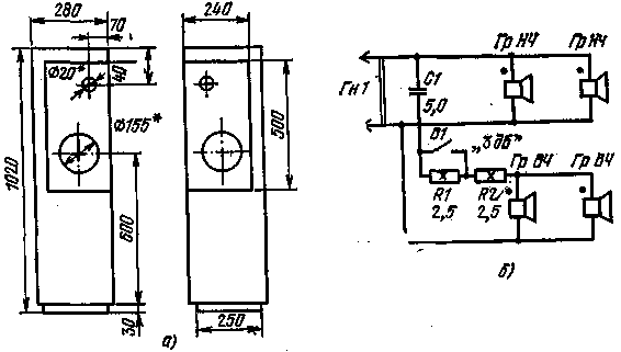 При повторении конструкции можно использовать компрессионную низкочастотную головку типа 6ГД-5 и высокочастотную головку ЗГД-31. В данной конструкции рекомендуется применять разделительный фильтр с частотой разделения около 3 кГц. Правда, головка типа 3ГД-31 имеет несколько большие размеры, чем высокочастотная головка, примененная автором конструкции. Это потребует некоторой переделки передней панели. Но можно обойтись и без переделок, если использовать высокочастотную головку типа 2ГД-36. Применение головки типа 2ГД-36 позволяет расширить полосу эффективно воспроизводимых частот до 18-20 кГц. Правда, здесь есть одна особенность. Некоторые образцы головок этого типа имеют относительно высокую частоту воспроизведения нижних частот - около б-6 кГц. В связи с этим может потребоваться изменить частоту разделения с 3 до 6 кГц. Для этого достаточно уменьшить число витков катушек L1 и L2 фильтра по схеме рис.2 до 70 и 90 соответственно, уменьшив при этом емкости конденсаторов С1 и С2 вдвое Громкоговоритель с расширенной диаграммой направленности. Наблюдения показали, что широкополосные и многополосные громкоговорители, у которых раскрывы диффузоров расположены в одной, обычно фронтальной плоскости, имеют один недостаток, обусловленный узостью диаграммы направленности излучения. Особенно заметна направленность в горизонтальной плоскости. Из-за этого сужается зона проявления стереоэффекта, ослабляется воспроизведение высших частот сигнала. Для борьбы с этим недостатком применяются различные средства, в том числе включение дополнительных громкоговорителей, размещенных определенным образом относительно основных громкоговорителей, вынесение отдельно средне- и высокочастотных головок, сведение сигналов нижних частот стереофонической системы в один монофонический сигнал и т. п. Радиолюбительская практика показывает, что увеличение числа громкоговорителей загромождает жилое помещение, приводит к увеличению числа соединительных проводников. Поэтому более целесообразным является создание таких громкоговорителей, которые обладали бы широкой диаграммой направленности в горизонтальной плоскости и не занимали бы много места. На рис. 4,а приведены эскизы корпуса громкоговорителя, а на рис. 4,б - принципиальная схема его разделительного фильтра. Как видно из рисунка, громкоговоритель имеет по паре головок низкой и высокой частоты, включенных параллельно. Высокочастотные головки включены через простейший разделительный фильтр, состоящий из конденсатора C1 и резисторов R1 и R2.