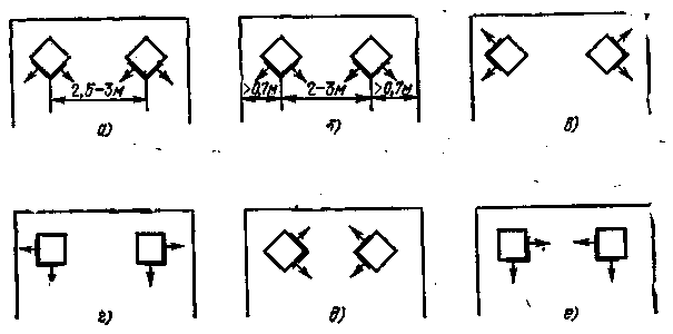 Согласно описанию конструкции, низкочастотные головки рассчитаны на 15 Вт, высокочастотные - на 10 Вт каждая. Таким образом, громкоговоритель может быть применен для совместной работы с УНЧ до 30 Вт. Высокочастотные головки на мощность практически не влияют из-за относительно высокой частоты разделения полос, равной примерно 6 кГц. Главным достоинством громкоговорителя является широкая диаграмма направленности излучения в горизонтальной плоскости, составляющая 270° на частотах вплоть до 12 кГц. Это достигается, как видно из рис. 4,а, размещением пар головок высокой и низкой частоты во взаимно перпендикулярных плоскостях, причем такое размещение четырех головок не увеличивает поперечного сечения корпуса громкоговорителя. Особенностью фильтра (рис. 4,б) является наличие дополнительного резистора R1, замыкаемого контактами В1. При разомкнутых контактах амплитудно-частотная характеристика громкоговорителя равномерна во всей .полосе воспроизводимых частот (от 60Гц по 18кГц). При замыкании контактов происходит дополнительный подъем отдачи на высших частотах (от 7 до 18 кГц) примерно на 3 дБ. Такая коррекция может потребоваться в том случае, когда в помещении находится много мягких предметов: шторы, занавеси и другие материалы, сильно поглощающие энергию звуковых колебаний высших частот. Своеобразное размещение головок в громкоговорителе открывает новые возможности для согласования размещения и взаимного положения громкоговорителей стереофонической установки с учетом акустики помещения. На рис.5 показано, как этого можно добиться, развернув громкоговорители в горизонтальной плоскости. Так, если комната средних размеров, а стены не-драпироваиные, то можно рекомендовать расположить громкоговорители так, как показано на рис.5,а. При этом корпуса громкоговорителей могут быть придвинуты вплотную к боковым стенам. В такой же комнате с мягкими стенами (задрапированными) .рекомендуется размещать громкоговорители не ближе 0,7 м от боковых стен (рис.5,б).