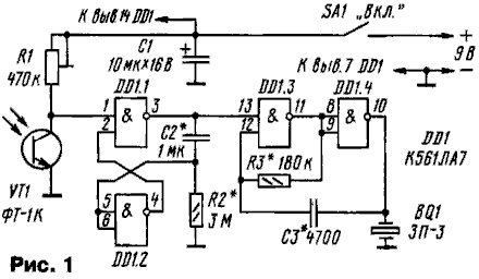 О лазерной указке и ее применении в различных конструкциях уже рассказывалось на страницах журнала "Радио". Продолжая эту тему, предлагаю описание фототира с использованием все той же лазерной указки. Этот электронный тир состоит из двух узлов - пистолета и мишени с фотодатчиком. Мишень устроена так, что при попадании в нее луча указки раздается звуковой сигнал. Мишень (рис. 1) содержит фотодатчик на фототранзисторе VT1, ждущий одновибратор на логических элементах DD1.1, DD1.2 и генератор ЗЧ на элементах DD1.3, DD1.4. В исходном состоянии фототранзистор освещен слабо, поэтому на его коллекторе высокий логический уровень. На выходе ждущего одновибратора (вывод 3 DD1.1) низкий логический уровень, генератор ЗЧ не работает.