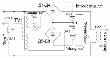 Рисунок 1 Аппарат работает следующим образом. При замыкании контактов выключателя SA1 см. рис.2 напряжение питания 220 в поступает на первичную обмотку трансформатора TV1. Конденсатор С1, подключенный через замкнутые контакты переключателя SA3 к выпрямительному мосту Д5-Д8, заряжается. Первичная обмотка трансформатора TV2 обесточена, так как тринистор VS1 закрыт. Рисунок 2 При нажатии на кнопку переключателя SA3 заряженный конденсатор С1 подключается к управляющему электроду тринистора через переменный резистор R1. Разрядный ток конденсатора открывает тринистор, и напряжение сети поступает на первичную обмотку сварочного трансформатора TV2. Если вторичная обмотка сварочного трансформатора соединена со свариваемыми деталями, то в ней возникает мощный импульс тока, который вызывает сильный разогрев металла в точке касания сварочного электрода. Длительность импульса тока зависит от параметров времязадающей цепи R1C1. При номиналов элементов этой цепи, максимальная длительность импульса ( без учета внутреннего сопротивления тринистора) примерно равна: iи =R1C1 =100× 1000× 10-6=0,1 с За это время ток во вторичной обмотке может достигать 300...250 А. Этого вполне достаточно для прочного приваривания к массивным конструкциям деталей из фольги толщиной до 0,15 мм, например из легированной стали 1Х18Н10Т. Оптимальный режим сварки устанавливается подстроечным резистором R1. Конструктивно