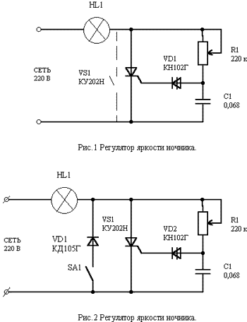 Тиристор VS1 управляется динистором VD1. При каждой полуволне сетевого напряжения конденсатор С1 заряжается через резистор R1. Когда напряжение на конденсаторе C1 поднимется до напряжения включения динистора VD1, он перейдет в открытое состояние. Тиристор VS1 открывается, а конденсатор С1 разряжается через динистор и управляющий вход тиристора. Изменяя сопротивление резистора R1, изменяем время заряда конденсатора, а, следовательно, время включения тиристора. Таким образом можно регулировать мощность нагрузки от ноля до Uc/2 – Uвк. Где – напряжение сети, Uвк – напряжение включения динистора. Поскольку тиристор открывается только при положительной полуволне напряжения, то и регулировка производится до половины сетевого напряжения. Для включения полной нагрузки может служить штатный выключатель светильника, показанный на рисунке пунктиром. Регулятором, показанным на рисунке 2, можно регулировать напряжение от ноля до 100% за вычетом напряжения включения динистора. При выключенном переключателе SA1 схема работает аналогично описанной выше. После включения переключателя SA1 одна полуволна напряжения проходит на лампу HL1 через диод VD1, а подача другой полуволны напряжения регулируется резистором R1. Регулятор напряжения по схеме рисунка 2 можно применить для регулировки температуры жала паяльника. В последнем случае переключатель SA1 может выполнять функцию включения дежурного режима. При максимальном сопротивлении резистора R1 и выключенном переключателе SA1 схема ток не потребляет, поэтому дополнительного выключателя сети не требуется. Динистор можно поставить с любой буквой, но потребуется подбор номинала резистора R1, так как напряжение включения динисторов разное.