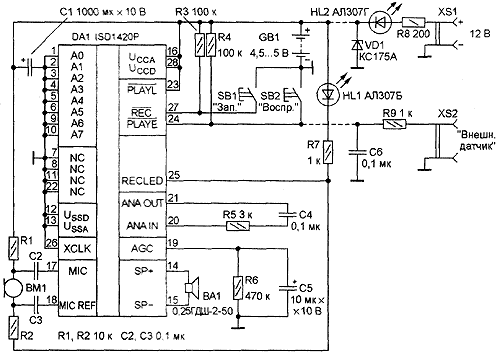 Желая оставить какое-либо сообщение отсутствующим в данный момент членам семьи или сослуживцам, многие используют записки, оставляемые на видном (или условленном) месте, или специальные доски. Упростить и ускорить эту процедуру можно, если в качестве носителя информации применить устройство на базе микросхемы ISD1416 (ISD1420) [1-3], -достаточно нажать на кнопку записи и произнести сообщение. Так же просто и получить информацию - нажать на соответствующую кнопку. Указанные микросхемы представляют собой устройства записи/воспроизведения звуковой информации и основаны на технологии хранения аналогового сигнала в многоуровневых энергонезависимых ячейках памяти. Необходимо отметить, что эта технология не требует применения аналого-цифрового и цифро-аналогового преобразования, и информация хранится в аналоговой форме. В состав микросхем ISD1416 и ISD1420 входят микрофонный усилитель с АРУ, устройство выборки-хранения, активные ФНЧ пятого порядка, усилитель ЗЧ с выходом, допускающим непосредственное подключение динамической головки, тактовый генератор и запоминающее устройство емкостью 128К. Частота дискретизации первой микросхемы - 8 кГц (верхняя граница полосы воспроизводимых частот - 3,3 кГц), второй - 6,4 кГц (2,6 кГц), продолжительность записи/воспроизведения - соответственно 16 и 20 с. Гарантируемый фирмой-изготовителем срок хранения информации - до 100 лет, а число циклов записи - до 100000. Принципиальная схема звуковой записки показана на рис.1. Включение микросхемы - типовое, для управления режимами работы используются две кнопки: SB1 (Запись) и SB2 (Воспроизведение). При нажатии на первую из них микросхема активизируется, на электретный микрофон ВМ1 подается поляризующее напряжение и загорается светодиод HL1, сигнализируя о том, что режим записи включен. Запись происходит в течение всего времени, пока кнопка нажата. По истечении указанного выше предельного времени микросхема автоматически переходит в дежурный режим. Поскольку в этом режиме потребляемый ею ток не превышает 0,5 мкА (типовое значение), специальный выключатель питания отсутствует.