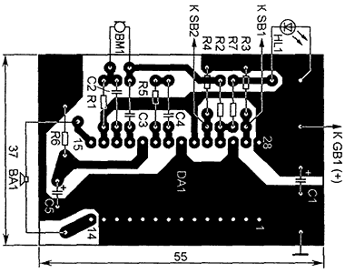 Рис.2. Печатная плата При желании светодиод HL1 допустимо исключить. В этом случае вместо него устанавливают проволочную перемычку и заменяют R7 резистором сопротивлением 10 кОм. Уменьшения габаритов можно достичь применением резисторов и конденсаторов для поверхностного монтажа, малогабаритных дисковых аккумуляторов (например, Д-0,125) и динамической головки от головных телефонов с указанным выше сопротивлением. При размещении платы на большом (несколько метров) расстоянии от датчика для соединения их желательно использовать экранированный провод и, кроме того, возможно, придется увеличить емкость конденсатора С6 и сопротивление резистора R9 в несколько раз. Источники