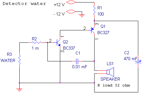 Представленная выше схема это простой индикатор воды. Чаще всего используется для сигнализации о состоянии уровня воды в различных конструкциях. Датчик устройства это "сопротивление" R3 по схеме - представляет собой обычный электропроводник. Чаще всего для сохранения надёжности устройства в качестве электрода применяют серебрянную или посеребрённую пластину. Соединение пластины с проводом обеспечивают механическим способом (крепежом с хромовым покрытием). Если датчик находится на значительном удалении от устройства (несколько десятков метров) необходимо позаботиться о соответствующем сечении провода и надёжности заземления устройства и водяной конструкции. ( Как вариант возможно сделать датчик с двумя электродами и не заземлять конструкцию).