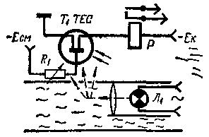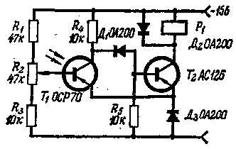 Рис.2 Управление светом в этом устройстве происходит следующим образом. В ждущем состоянии транзистор Т1 освещен, через него течет ток, через транзистор Т2 и обмотку реле Р1 ток не протекает. Затемнение светового потока уменьшает ток через фототранзистор. Транзистор Тг переходит в режим насыщения, его коллекторный ток вызывает срабатывание реле и замыкание контактов в цепи питания сигнального устройства. "ToufeI Electronigue", 1969, N 332 .