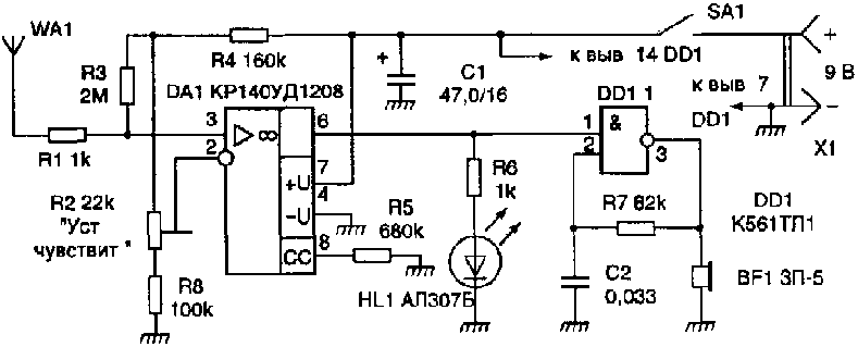 микромощный операционный усилитель DA1, и генератора колебаний звуковой