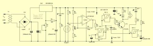 порога компаратор на микросхеме DA2 меняет свое состояние и