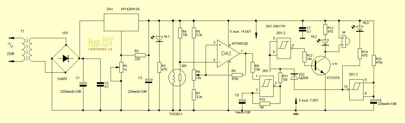 датчиков, реагирующих на различные газы. Схема устройства вот такая