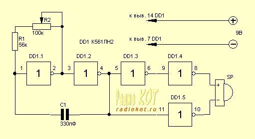 Все сделано на одной микросхеме К561ЛН2, содержащей в себе