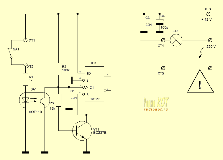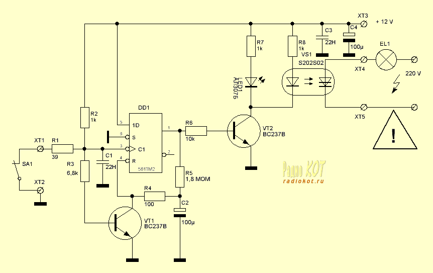 Сам одновибратор собран на одном триггере D-типа микросхемы К561ТМ2. Для обеспечения перезапуска добавлен каскад на транзисторе VT1. При поступлении следующего импульса Этот транзистор разряжает времязадающий конденсатор С2. Для ограничения тока разряда введён резистор R4. Выходной логический сигнал с прямого выхода триггера через токоограничивающий резистор управляет ключём на транзисторе VT2. В коллектор этого транзистора включён светодиод оптронного симисторного ключа VS1. Для индикации срабатывания схемы можно добавить резистор R7 и красный светодиод LED1. Симистор оптрона включён параллельно силовому выключателю света в автоматизируемом помещении через контакты ХТ4 и ХТ5. Данное подключение позволяет сохранить независимость управления светом как со схемы автоматики, так и прежним, традиционным способом. Детали и монтаж. Тсек=0,7 R(Мом)ХС(мкф)