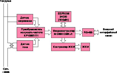 Реализация цифрового счётчика электрической энергии (рис. 2) требует специализированных ИС, способных производить перемножение сигналов и предоставлять полученную величину в удобной для микроконтроллера форме. Например, преобразователь активной мощности — в частоту следования импульсов. Общее количество пришедших импульсов, подсчитываемое микроконтроллером, прямо пропорционально потребляемой электроэнергии.