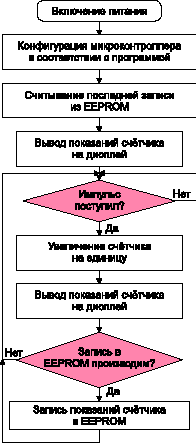 Сигналы, пропорциональные напряжению и току в сети, снимаются с датчиков и поступают на вход преобразователя. ИС преобразователя перемножает входные сигналы, получая мгновенную потребляемую мощность. Этот сигнал поступает на вход микроконтроллера, преобразующего его в Вт·ч и, по мере накопления сигналов, изменяющего показания счётчика. Частые сбои напряжения питания приводят к необходимости использования EEPROM для сохранения показаний счётчика. Поскольку сбои по питанию являются наиболее характерной аварийной ситуацией, такая защита необходима в любом цифровом счётчике. Алгоритм работы программы (рис. 4) для простейшего варианта такого счётчика довольно прост. При включении питания микроконтроллер конфигурируется в соответствии с программой, считывает из EEPROM последнее сохранённое значение и выводит его на дисплей. Затем контроллер переходит в режим подсчёта импульсов, поступающих от ИС преобразователя, и, по мере накопления каждого Вт·ч, увеличивает показания счётчика.