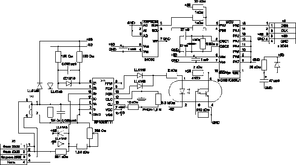 При записи в EEPROM значение накопленной энергии может быть утеряно в момент отключения напряжения. По этим причинам значение накопленной энергии записывается в EEPROM циклически друг за другом через определённое число изменений показаний счётчика, заданное программно, в зависимости от требуемой точности. Это позволяет избежать потери данных о накопленной энергии. При появлении напряжения микроконтроллер анализирует все значения в EEPROM и выбирает последнее. Для минимальных потерь достаточно записывать значения с шагом 100 Вт·ч. Эту величину можно менять в программе. Схема цифрового вычислителя показана на рис. 5. К разъёму X1 подключается напряжение питания 220 В и нагрузка. С датчиков тока и напряжения сигналы поступают на микросхему преобразователя КР1095ПП1 с оптронной развязкой частотного выхода. Основу счётчика составляет микроконтроллер MC68HC05KJ1 фирмы Motorola, выпускаемый в 16-выводном корпусе (DIP или SOIC) и имеющий 1,2 Кбайт ПЗУ и 64 байт ОЗУ. Для хранения накопленного количества энергии при сбоях по питанию используется EEPROM малого объёма 24С00 (16 байт) фирмы Microchip. В качестве дисплея используется 8-разрядный 7-сегментный ЖКИ, управляемый любым недорогим контроллером, обменивающийся с центральным микроконтроллером по протоколу SPI или I2C и подключаемый к разъёму Х2. Реализация алгоритма потребовала менее 1 Кбайт памяти и менее половины портов ввода/вывода микроконтроллера MC68HC05KJ1. Его возможностей достаточно, чтобы добавить некоторые сервисные функции, например, объединение счётчиков в сеть по интерфейсу RS-485. Эта функция позволит получать информацию о накопленной энергии в сервисном центре и отключать электричество в случае отсутствия оплаты. Сетью из таких счётчиков можно оборудовать жилой многоэтажный дом. Все показания по сети будут поступать в диспетчерский центр. Определённый интерес представляет собой семейство 8-разрядных микроконтроллеров с расположенной на кристалле FLASH-памятью. Поскольку его можно программировать непосредственно на собранной плате, обеспечивается защищённость программного кода и возможность обновления ПО без монтажных работ.