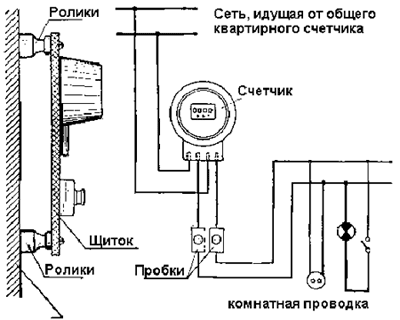 Установка и подключение электро-счетчика не вызывает затруднений. Щиток со счетчиком надо установить на четырех роликах (по углам щитка) в комнате, в близи того места, откуда проходит электропроводка от общего квартирного счетчика. Присоединять электросчетчик нужно по приводимой ниже схеме (рис.1).