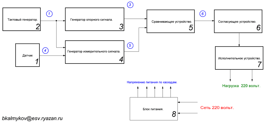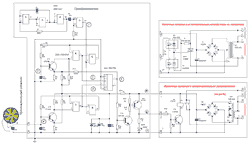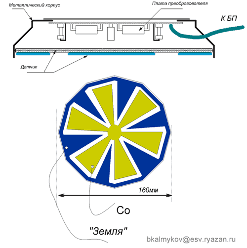 Несущим элементом является металлический корпус с размещенным в нем диском из фольгированного текстолита толщиной 1,5мм и диаметром 160мм. Рисунок датчика нанесен краской по трафарету. Не защищенные участки вытравлены, к получившимся зонам (обкладкам конденсатора датчика) подпаяны провода для подключения в схему. Настройка сигнализатора состоит в проверке напряжения питания микросхем и контроле соответствия сигналов в контрольных точках в соответствии с рисунками 2 и 3. При исходном состоянии датчика длительность импульса на выводе 3 микросхемы DD3, должна быть меньше длительности импульса выводе 5 той же МС. Достигается это регулировкой подстроечного резистора R4. При приближении руки к датчику на выходе 1 микросхемы DD3 должен быть переход с состояния «0» в состояние «1». Чувствительность уточняется незначительным изменением положения резистора R4. Настройка остальной части схемы, при исправных деталях, не требуется. Конструктивно сигнализатор собран из двух блоков (выделено на рисунке 3). Левая (по схеме) часть собрана в непосредственной близости от датчика, в одном корпусе. Правая часть – отдельным блоком. Соединение между блоками 3-х проводное, не ограниченной длины (в разумных пределах). На вопросы интересующихся отвечу по bkalmykov[собака]esv.ryazan.ru Автор: Калмыков Б.М.