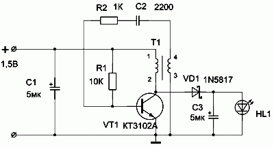 Использование старого калькулятора, вернее его деталей, в частности импульсного трансформатора позволило создать экономичный светодиодный фонарь. Ручные фонари на сверхъярких светодиодах быстро завоевывают популярность. В описываемых конструкциях в том числе и в журнале Радио приводятся описания фонарей в основном на дефицитных для многих радиолюбителей специализированных микросхемах, да и намотка импульсных трансформаторов требует определенного навыка. При разработке фонаря ставились задачи: максимальная простота, минимум дефицитных деталей, экономичность и возможность работы от одного элемента питания напряжением 1,5 Вольта. Внимание привлек источник питания калькулятора Б3-30 (их сейчас можно найти всегда) Дело в том, что в импульсном источнике питания используется трансформатор толщиной всего 5 мм, имеющий две обмотки. В основу преобразователя легла схема калькулятора Б3-30, исключив из нее стабилизатор на 7,5 Вольта. В результате получилась очень простая схема с использованием деталей калькулятора рис.1.