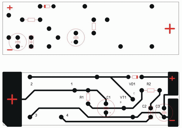 При испытании использовалась самая дешевая батарейка типа АА стоимостью всего 3 р. Начальное напряжение под нагрузкой составило 1,28 В. На выходе преобразователя напряжение измеренное на сверхъярком светодиоде 2,83 В. Марка светодиода неизвестна, диаметр 10 мм. Общий потребляемый ток 14 mА. Яркость свечения сопоставима с фонарем изготовленном по описанию в журнале Радио 2004-9-54. Суммарное время работы фонаря составило 20 часов непрерывной работы. При снижении напряжения на элементе питания ниже 1 В яркость заметно падает. Преобразователь напряжения выполнен по схеме однотактного генератора с индуктивной обратной связью на транзисторе VT1 и трансформаторе Т1. Импульсное напряжение с обмотки 1-2 (по принципиальной схеме калькулятора Б3-30) выпрямляется диодом VD1 и подается на сверхъяркий светодиод HL1. Конденсатор С3 фильтр. За основу конструкции взят фонарь китайского производства рассчитанного на установку двух элементов питания типа АА. Преобразователь монтируется на печатной плате из односторонне фольгированного стеклотекстолита толщиной 1,5 мм рис.2 размерами заменяющими один элемент питания и вставляемой в фонарь вместо него. К торцу платы обозначенной знаком "+" припаивается контакт изготовленный из двухсторонне фольгированного стеклотекстолита диаметром 15мм, обе стороны фольги соединяются перемычкой и облуживаются припоем.