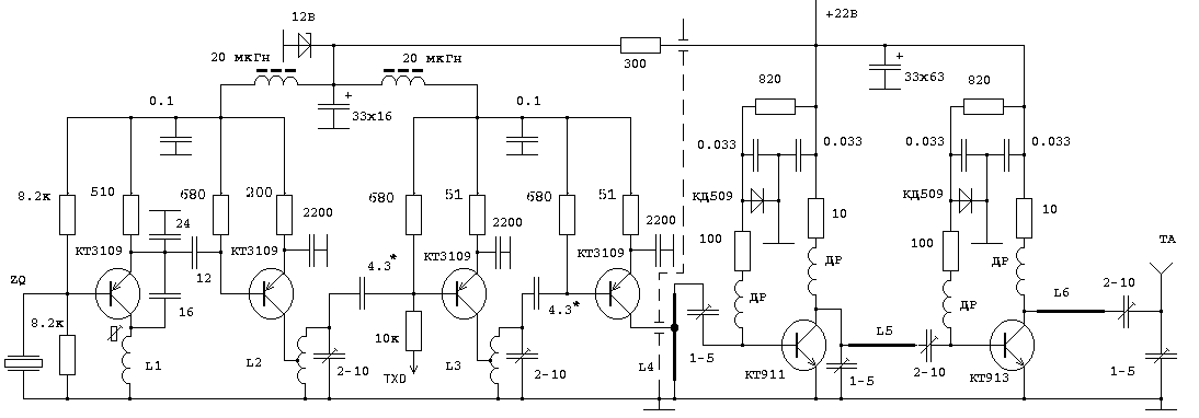 ПЕРЕДАТЧИК оригинальностью не отличается и построен по схеме с кварцевой стабилизацией и умножением частоты. Задающий генератор возбуждается на 5-7-й гармонике, далее следует утроитель частоты, затем усилитель-модулятор и удвоитель частоты с нагрузкой L4. Первые 4 каскада отделены экраном и собраны на печатной плате согласно [Л1]. Кварцевый резонатор выбирается из расчета Fкв=Fиз/n1/n2/n4, где n1 - номер гармоники, на которой возбуждается резонатор (3,5,7,9), n2=3 или 2 (второй каскад), n4=2 (четвертый каскад).