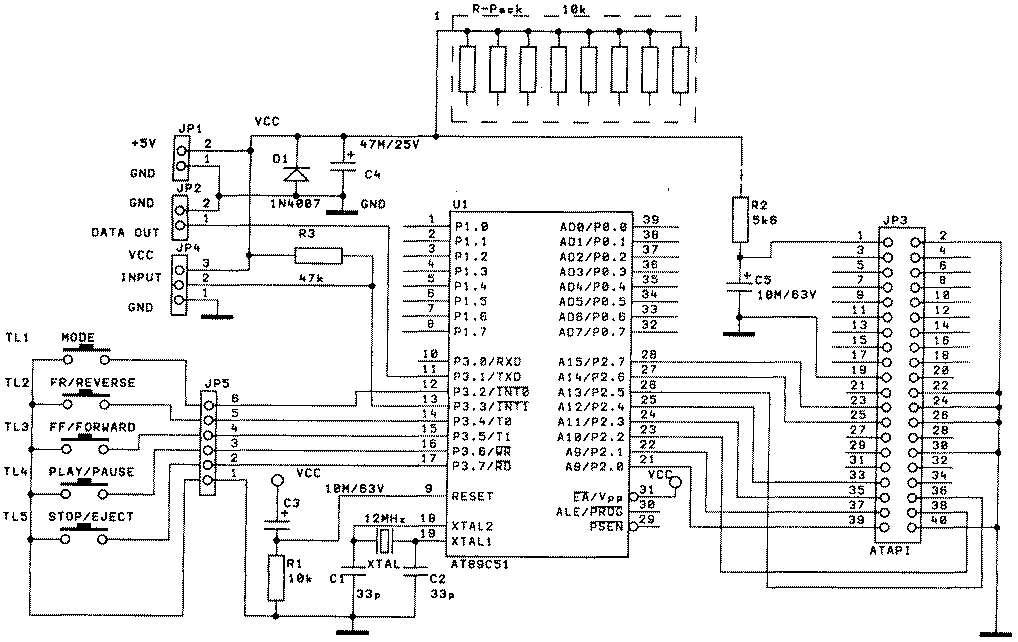 Контроллер позволяет превратить компьютерный CDROM в автономный аудиоплеер. Кнопками TL1-TL5 можно включать привычные для плеера режимы, которые формируются микроконтроллером U1 Atmel АТ89С51 и передаются в CDROM по стандартному ATAPI/ IDE кабелю с разъема JP3. К разъему JP4 можно подключить модуль приемника ИК ДУ (автор применил SFH508 от ТВ OVP Orava), выдающего коды стандартного протокола RC-5.