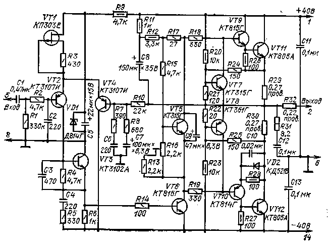 Puc.1 Квазикомплементарный выходной каскад, выполненный на составных транзисторах (VT9, VT11 и VT10, VT12), хорошо согласовывается с низкоомной нагрузкой. Корректирующая цепь, состоящая из параллельно соединенных диода VD2, резистора R28 и конденсатора С10, улучшает симметрию плеч усилителя, уменьшая тем самым нелинейные искажения. Начальное смещение на базах выходных транзисторов для работы в режиме АВ определяется падением напряжения на участке коллектор-эмиттер транзистора VT5 и регулируется ре-зистором R16. Транзисторы VT7 и VT8 шунтируют при перегрузке эмиттерный переход выходных транзисторов, осуществляя тем самым их защиту. Элементы С3, R5, С4, R31, С12 предотвращают самовозбуждение усилителя на высоких частотах. Цепь R7, Сб служит для выравнивания АЧХ усилителя на высоких частотах звукового диапазона (до 20 кГц). Конструктивно усилитель собран на печатной плате. Температурная стабилизация тока покоя выходных транзисторов осуществляется с помощью транзистора VT5, установленного на общем с VT12 или VT11 радиаторе; в непосредственной близости от них. Для питания усилителя необ-ходим двухполярный источник, обеспечивающий при напряжении ±40 В ток не менее 2,5 А. Налаживание усилителя, собранного из исправных элементов, заключается в проверке правильности монтажа и установке тока покоя выходных транзисторов резистором R16 в пределах 20... 40 мА.