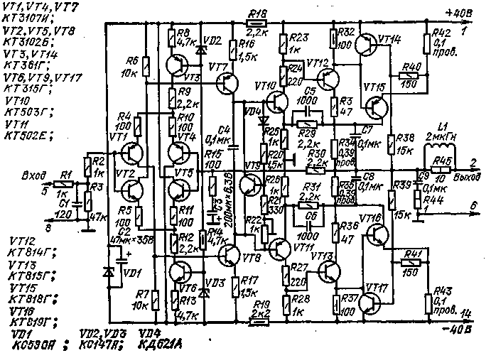 Puc.1 Принципиальная схема усилителя показана на рис.1. Он содержит диффе-ренциальный каскад на комплементарных транзисторах (VT1, VT4, VT2, VT5), каскад усиления сигнала по напряжению [VT7, VT8), выходной каскад (VTIO- VТ13, VT15, VT16) и устройство защиты от перегрузок по току (VT14, VT17). Дифференциальный входной каскад на комплементарных транзисторах имеет дополнительное преимущество по сравнению с обычным: при равенстве базовых токов транзисторов VT1 и VT2 (VT4 и VT5) через резисторы R2 и R3 и через резистор R30 ток может вообще не протекать. Это позволяет, не нарушая ба-лансировки каскада, изменять сопротивление этих резисторов в достаточно боль-ших пределах. Чтобы увеличить коэффициент передачи по напряжению и улучшить линейность при высокой термостабильности, в эмиттерные цепи транзис-торов дифференциального каскада включены источники тока на транзистора VT3 и VT6. Каскад усиления по напряжению выполнен на комплементарной паре транзисторов VT7 и VT8, работающих в режиме А. Плечи выходного каскада содержат по три транзистора VT10, VT12, VT15 (VT11, VT13, VT16}, охваченных местной ООС через резисторы R25 и R29 (и сответственно R26 и R31). При этом коэффициент усиления по напряжению каждой тройки транзисторов приближается к трем. Местная ООС позволяет также уменьшить разброс в коэффициентах усиления плеч выходного каскада, что снижает требование к идентичности параметров комплементарных транзисторов. Еще одна особенность выходного каскада состоит в следующем. Напряжение местной ООС, охватывающей тройку транзисторов, снимается с резисторов R34 и R35, напряжение на которых пропорционально любым изменениям тока выходных транзисторов (в том числе и в зависимости от температуры). Это дополнительно стабилизирует ток покоя выходных транзисторов. Напряже-ние смещения транзисторов VT10 и VT11 зависит от падения напряжения на участке эмиттер-коллектор транзистора VT9, задаваемого делителем на эле-ментах VD4, R20 - R22. Параметрическая ООС через диод VD4, расположенный на общем с выходными транзисторами теплоотводе, осуществляет температурную стабилизацию тока покоя транзисторов VT15, VT16. С увеличением температуры уменьшается падение напряжения и на диоде VD4, при этом уменьшается и напряжение эмиттер - коллектор VT9. Все это позволяет поддерживать ток покоя выходдах транзисторов на постоянном уровне при разных уровнях мощности и коле-баниях температуры окружающей среды. Весь усилитель охвачен общей ООС, напряжение которой с выхода усилителя через делитель R30, RI5, СЗ подается на базы транзисторов VT4, VT5. Элементы С1, С5, С6, С7, С8, С9, R44, L1 предназначены для коррекции частотной характеристики на высоких частотах. Они же обеспечивают устойчи-вость усилителя при охвате его общей ООС и при возможных изменениях нагрузки. Транзисторы VT14, VT17 шунтируют при перегрузке эмиттерный переход выходных транзисторов. Питается усилитель от нестабилизированного двухполярного источника ±40 В. Диод VD4 размещен на теплоотводе рядом с транзисторами VT15 или VT16. В усилителе использованы резисторы МЛТ, СПЗ-1К (R22), конденсаторы К50-6, КМ. Ка-тушка LI намотана на резисторе R45 (МЛТ-2) и содержит 10 витков провода ПЭВ-2 0,8. Для питания усилителя требуется двухполярный источник, обеспечивающий при напряжении ±40 В ток не менее 2 А. Регулировка усилителя, собранного из исправных элементов, заключается в проверке правильности монтажа и установке 