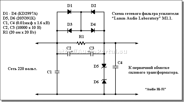 Перед трансформаторами питания установлен помехоподавляющий фильтр, взятый один к одному из усилителя Lamm M1.1, схема которого (фильтра), если кому интересно, находится ниже: