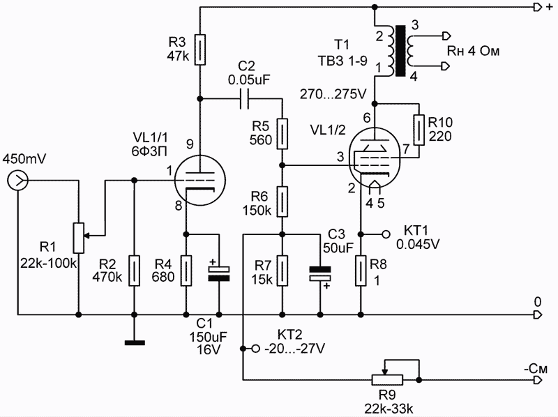 Второй каскад нагружен на выходной трансформатор ТВЗ-1-9