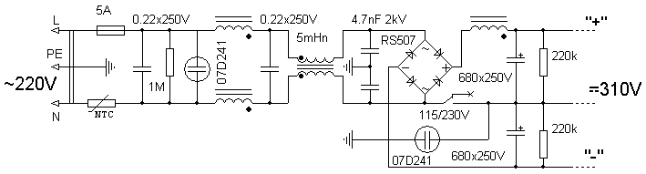 Из всех элементов в схеме фильтра обычного БП присутствует только терморезистор PS405L и предохранитель. (самое необходимое)Иногда ставят симметричный трансформатор (на схеме – 5mH). Само собой - выпрямитель RS205 и высоковольтный фильтр постоянного тока (2 электролита 220х200В)