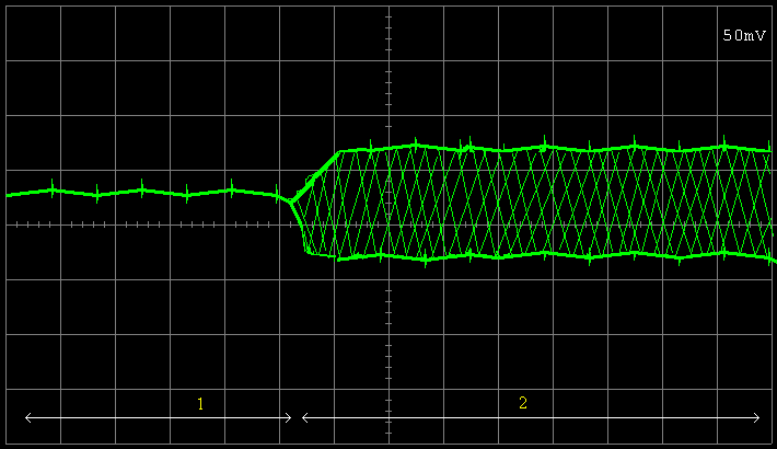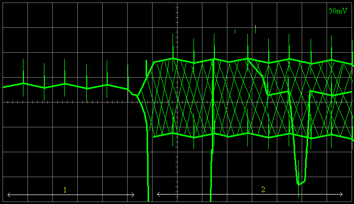 На Рис.2 участок №1 – статическая нагрузка.Участок №2 – HDD в режиме чтение/запись. Характерны провалы напряжения питания +12В. Величина и длительность провала зависит от параметров фильтра блока питания и мощности HDD.Следствие: Из-за нестабильности шины питания +12В жесткий диск начинаетхлопать головами по “блинам”. Появляются бэды.Глюки утройств питающихся от шины +12В (ISA карты, COM порты)