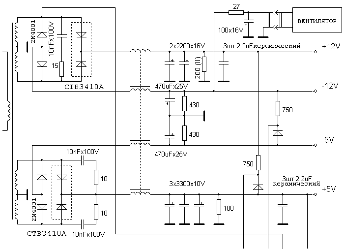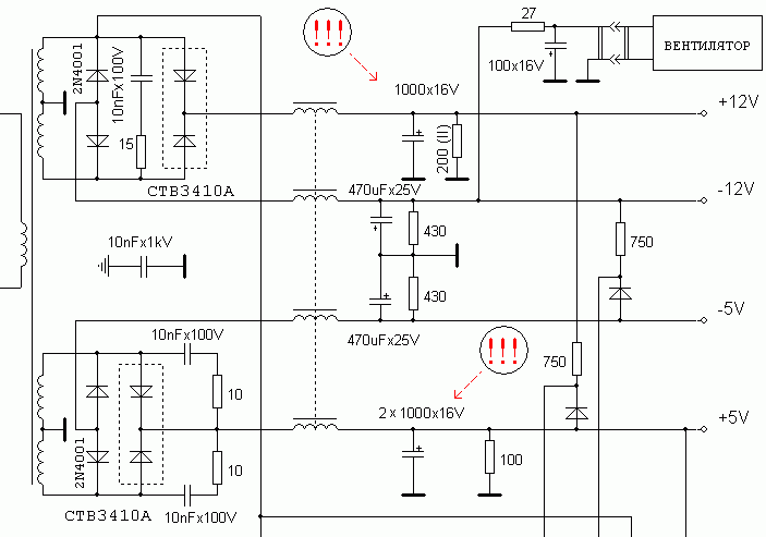 Для этой схемы (Рис4.) справедливы следующие параметры:Шина +5В – максимальный динамический ток нагрузки 20А.Шина +12В – максимальный динамический ток нагрузки 8А.Электролитические конденсаторы устраняют нестабильность по току.Керамические (2.2мкФ 3..6шт.) устраняют импульсные выбросы напряжения.Рекомендуется серия с низким сопротивлением для импульсных токов(кажись так называется)Каждая фирма маркирует их посвоему. Из того, что можно достать вПитере - например Hitano, Серия EXR, рабочая температура до 105 цельсия.Для +5В - две штучки 2200мкФ или 3300мкФ 6,3 или 10В (нужно смотретьгабариты, производители БП очень сильно ужимают место)С керамикой ничего посоветовать не могу.Из того что видел отличаются только ТКЕ и точностью ( например +80 -50% ).Думаю в фильтрах такого рода это не принципиально. Тут чем больше емкость, темлучше. Наверное лучше брать SMD (бескорпусную) и паять с обратной стороны платы прямо на проводники.По поводу катушек в выходных фильтрах:Если нет опыта намотки - лучше не эксперементировать. Если есть возможность купить, то можно попробовать. Или выпаять из мертвого БП.С катушками на выходе - нужно быть очень осторожным. Блок проверять тольконагружая на резисторы.После модернизации фильтра смотрим осциллограмму.