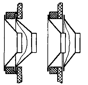 где с - скорость звука, К - безразмерная величина, постоянная для данного типа головки и акустического оформления. V - заданный объем ящика громкоговорителя. Приведенная формула показывает, что платой за снижение нижней граничной частоты воспроизводимого громкоговорителем диапазона является уменьшение его КПД. Это, однако, с лихвой окупается тем. что при сдваивании головок уменьшаются все виды искажений воспроизводимого ими сигнала. Помимо причин, на которые указывалось в [1], этому способствует еще одно немаловажное обстоятельство. Дело в том, что неравномерность звукового поля внутри ящика громкоговорителя приводит к сильной неравномерности его АЧХ. Неравномерное распределение звукового давления внутри ящика может, кроме того, явиться причиной деформации диффузора (особенно легкого и тонкого) головки, что, в свою очередь, способствует возникновению нелинейных и интермодуляционных искажений. В случае использования сдвоенных головок все эти неприятные явления возникают лишь на внутренней головке, на внешней же, благодаря демпфирующему действию заключенного между головками воздуха, значительно ослабляются. Для устранения источника этих искажений частотный спектр колебаний, подаваемых на внутреннюю головку, в зависимости от размеров громкоговорителя рекомендуется ограничить до 100...300 Гц. Ослабить вредное влияние внутренних резонансов ящика на качество воспроизведения можно и установкой между головками или на тыльной стороне внутренней головки панелей акустического сопротивления (ПАС). В обоих случаях ПАС рекомендуется размещать в отверстиях диффузородержателей головок. Следует также иметь в виду, что ПАС снижает добротность головки, а это может оказаться весьма кстати, поскольку в некоторых случаях позволит использовать усилитель НЧ без ПОС по току. Известно, что качество звучания громкоговорителя зависит от равномерности не только АЧХ, но и ФЧХ, Сглаживание ФЧХ добиваются как в электрическом (путем выбора соответствующих разделительных фильтров), так и в акустическом трактах (руководствуясь рекомендациями, приведенными в [4]). Определенного выравнивания фаз, излучаемых головками звуковых колебаний, можно достигнуть, например, расположением звуковых катушек головок в одной плоскости, перпендикулярной акустической оси громкоговорителя. Однако указанная мера часто оказывается недостаточной, особенно при использовании головок со значительно отличающимися массами подвижных систем и с диффузорами из материалов разной плотности. В первом случае это объясняется тем, что фазовые сдвиги, вносимые головками на средних и высших частотах, при прочих равных условиях тем больше. чем больше масса подвижной системы, а во втором - тем, что фазовые сдвиги зависят от скорости распространения звуковых волн по поверхности диффузора. Эти обстоятельства вынуждают выдвигать вперед низкочастотную головку по отношению к среднечастотной, а среднечастотную - по отношению к высокочастотной. Необходимое дополнительное смещение головок можно найти экспериментально, подав на вход усилителя, с которым работает громкоговоритель, напряжение прямоугольной формы частотой 0,7fр (здесь fp - частота раздела) и наблюдая переходный процесс сигнала, снимаемого с измерительного микрофона, установленного на акустической оси головок. Учи