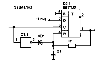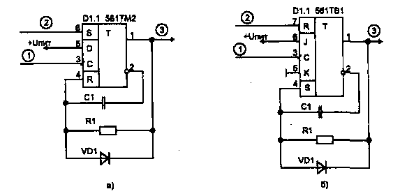 Длительность подаваемых на вход S запускающих импульсов должна быть меньше формируемого (режим, когда на входах S и R одновременно присутствует лог. "1", является запрещенным). На входе С длительность запускающего импульса может быть любой. Диод VD1 ускоряет разряд конденсатора через выход триггера и позволяет увеличить частоту запускающих импульсов (его применение уменьшает время восстановления схемы). Длительность формируемых им пульсов составляет приблизительно tи=0,69R1C1. Минимальное значение сопротивления R1 ограничено максимально допустимым выходным током триггера Его можно менять в пределах 20 кОм...10 МОм, при этом длительность импульса будет меняться в 500 раз. Одновременное изменение значений R1 и С1 позволяет регулировать длительности импульсов в пределах четырех порядков.