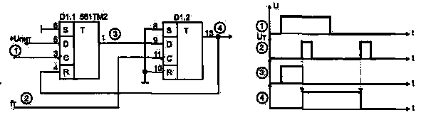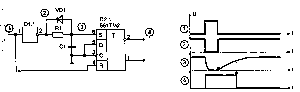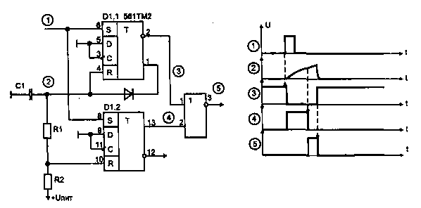 Рис. 1. 23 Ждущий мультивибратор на триггере с возможностью перезапуска.