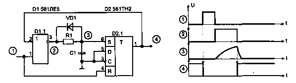 Если требуется иметь перезапуск одновибратора на триггере, в случае прихода очередного входного импульса во время формирования интервала, то схема на рис. 1.23 позволяет увеличить длительность выходного импульса за счет начала отсчета с момента окончания запускающего сигнала. Аналогичная схема приведена на рис. 1. 24. Когда на входе действует лог. "0", конденсатор заряжен до величины напряжения питания (лог. "1"). При поступлении запускающего импульса с длительностью, достаточной для разряда конденсатора, триггер перебросится и генерирует импульс. Длительность этого импульса, после окончания действия входного сигнала, определяется необходимым временем для заряда конденсатора до уровня лог. "1".