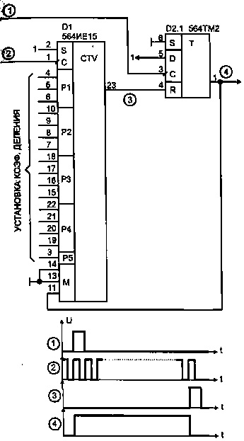 Второй метод получения импульса нужной длительности связан с использованием счетчиков — цифровых одновибраторов Их применяют, когда временной интервал должен быть очень большим или предъявляют высокие требования к стабильности формируемого интервала В этом случае минимальная получаемая длительность ограничена только быстродействием используемых элементов, а максимальная длительность может быть любой (в отличие от схем, использующих RC-цепи).