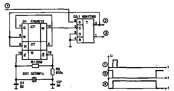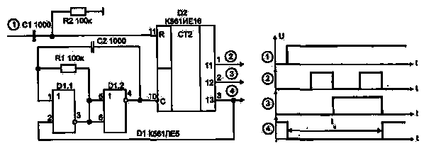 В исходном состоянии на выходе счетчика D2/3 (4) присутствует напряжение лог. "1", что запрещает работу автогенератора на D1.1, D1.2. Запускающий импульс обнуляет счетчик D2, и на его выходе D2/3 будет лог. "0" до момента, пока он не досчитает до появления на D2/3 лог. "1". Поскольку формирование выходного импульса всегда начинается из одного и того же состояния задающего генератора, то исключена случайная погрешность длительности импульса, но эта схема имеет другой недостаток: при включении питания она формирует на выходе импульс неопределенной длительности (в пределах заданного интервала). Схеме присуще свойство перезапуска в случае, если во время формирования выходного импульса появляется очередной запускающий (отсчет длительности формируемого импульса начинается заново).