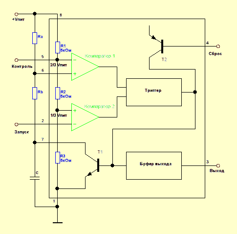же подключен вывод 7 - Разряд. Входной импульс подается на вывод 2 -