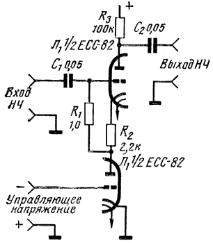 С помощью этой схемы возможно производить регулирование громкости на расстоянии посредством изменения управляющего напряжения постоянного тока. Анодное напряжение верхнего триода должно составлять 90...250 В. Схема может быть также применена для сжатия или расширения динамического диапазона и для ограничения помех.