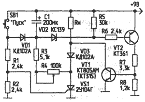 Рис. 1. Принципиальная схема тиристорного таймера 1 Когда напряжение на обкладках конденсатора превысит напряжение пробоя стабилитрона VD2, конденсатор разряжается через переход эмиттер-база транзистора VT2. Он открывается, соответственно, открывается и транзистор VT1. Этот транзистор шунтирует цепочку последовательно включенных тиристора VS1 и диода VD3. Поскольку падение напряжения на открытом транзисторе мало, такое шунтирование равнозначно прерыванию тока через тиристор. Следовательно, тиристор выключается. Зарядный процесс прекращается (R4 отключен от зарядной цепи), и, поскольку конденсатор С1 уже успел частично разрядиться, напряжение на нем понизилось настолько, что стабилитрон VD2 перестает проводить ток и участвовать в зарядном процессе. Соответственно, транзисторы VT2 и VT1 закрываются. Схема переходит в исходное состояние и готова к очередному включению. Интервал экспозиций таймера определяется постоянной времени τ=С1(R3+R4) и составляет для указанных на схеме номиналов 1...20 с. В силу краткосрочности переходных процессов, в качестве транзистора VT1 можно использовать маломощные транзисторы КТ315. В схеме желательно применять транзисторы с высокими значениями р.