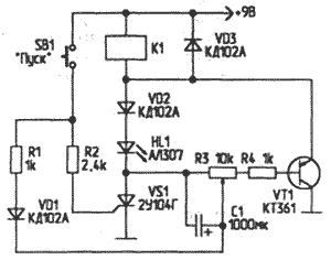 Рис.2. Принципиальная схема тиристорного таймера 2 Второй таймер (рис.2) работает по принципу разряда заряженного конденсатора. В исходном состоянии тиристор и транзистор закрыты. При нажатии на пусковую кнопку SB1 управляющее напряжение включает тиристор. Одновременно заряжается конденсатор С1. Напряжение, снимаемое с С1, складывается "в противофазе" с напряжением, поступающим через открытый тиристор, потенциометр R3 и резистор R4, на базу VT1. После того как С1 разрядится через включенный параллельно ему участок потенциометра R3, VT1 откроется и зашунтирует цепочку последовательно включенных VS1-HL1-VD2. Тиристор отключается, размыкая цепь питания нагрузки и цепь управления транзистора VT1. Схема возращается в исходное состояние. Время экспозиции можно устанавливать от 0 (при полностью введенной ручке потенциометра R3) до 40 с. В качестве нагрузки используется герконовое реле К1 на рабочее напряжение 5 В (РМК 11105) сопротивлением 350 Ом. Светодиод HL1 индицирует включенное состояние устройства. Максимальный ток нагрузки не должен превышать 20 мА. Автор: М. ШУСТОВ, г.Томск