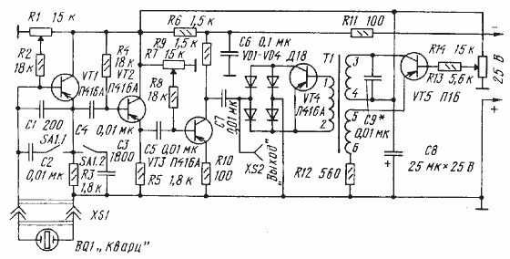 генерации определяется подключаемым к гнездам XS1 кварцевым резонатором.