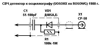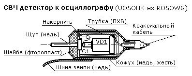 Этот простой детектор я не собирался рисовать. Но масса писем с вопросами по настройке моих конвертеров MMDS показала, что даже начинающие радиолюбители пытаются повторить их. Не советовал бы браться за СВЧ устройства новичкам в радиотехнике. Опытные радиолюбители всегда имеют под рукой подобные самодельные “фишечки” вроде этого детектора. Вот для тех, у кого еще такой приставки нет, эта публикация. Этот пробничек я сделал для настройки в.ч. трактов своих спутниковых приемников и использовал совместно с генератором качающейся частоты. Оказалось, что его удобно использовать не только для СВЧ но и других радиоустройств, даже для тех к которым у меня были заводские измерительные приборы. И последущие 15 лет я постоянно им пользовался. Основой пробника является СВЧ диод от пеленгаторов или радарных установок. В старой военной технике он часто использовался. Надев на него ПХВ трубку обернул его медной лентой с заземляющим хвостиком и припаял непосредственно на тонкий вывод диода разделительный конденсатор КМ-4а и резистор. Выводом этого конденсатора касался исследуемой схемы. Второй вывод диода и получившийся цилиндр медного экрана завершил пружинящими контактами. Эту насадку одевал на коаксиальную головку осциллографического щупа. Потом я делал такие детекторы с разными диодами как самостоятельные осциллографические щупы. Почему нужен осциллограф? Оказалось, что применение именно осциллографа как индикатора выпрямленного постоянного тока имеет много преимуществ. Во первых у осциллографа высокоомный вход (обычно 1 МОм) и получившийся пробник мало нагружает обмеряемую цепь. К тому же высокоомная нагрузка детектора обеспечивает его линейность, что позволяет измерять очень малые напряжения (милливольты). Высокая чувствительность осциллографа и динамичное отображение огибающей измеряемого сигнала позволяют использовать пробник для сравнения частот методом биений на гармониках радиочастотного генератора (ГСС), наблюдать процессы самовозбуждения схем, большие шумы и вообще сигнал в динамике. Диод детектора предназначен для рабочих длинн волн ~3 см (10ГГц), поэтому детектор достаточно линеен в широкой полосе частот. И хотя это только индикатор, но и им можно точно измерять величину напряжения или коэффициент усиления устройств используя метод замещения. Прямое же измерение по шкалам осциллографа дает лишь приблизительную оценку уровня сигнала. При применении детектора не подавайте на него напряжение более 1 вольта, иначе испортите диод. Для настройки более мощных устройств, сделайте другой щуп с более высоковольтным диодом, подходящим для ваших целей. В детекторе я применял диоды Д405А,Д405Б,Д605,Д602,КД514А,Д18. Последние два на частотах ниже 1ГГц. Так же область допустимых входных напряжений можно расширить применив емкостной делитель напряжения на входе детектора. Длины выводов для подключения к схеме должны быть как можно короче, нормально 1-2 см. Земляной вывод сделан в виде шинки 10 мм шириной, и при измерениях его нужно подключать в первую очередь. Измеритель- ный шуп забивается в изоляционную шайбу а её закрепляем в корпусе кернением по кругу. Механические нагрузки на конденса тор С1 должны быть исключены, дабы не повредить его обкладки. В этом пробнике выходной сигнал имеет отрицательную полярность. Для смены полярно