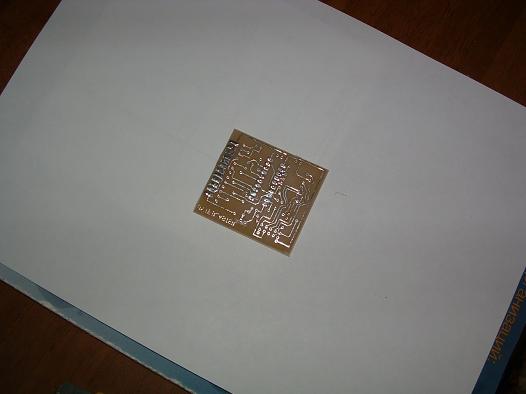 справа видно. Далее снимаем лист офисной бумаги и кладем наконец подложку рисунком к фольге платы, Разлаживаем тампоном из тряпки Подложка прилипнет к плате тут же (если температура была достаточной, см. выше) Снова накрываем это листом офисной бумаги А4 и кладем утюг