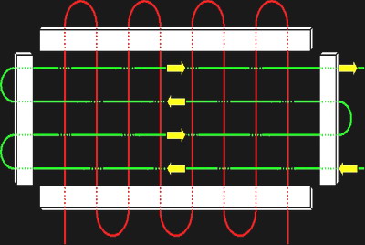 Далее из лески по следующей схеме натягивается сетка. Сначала между длинными противоположными планками: