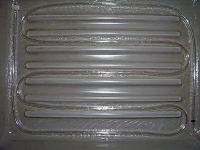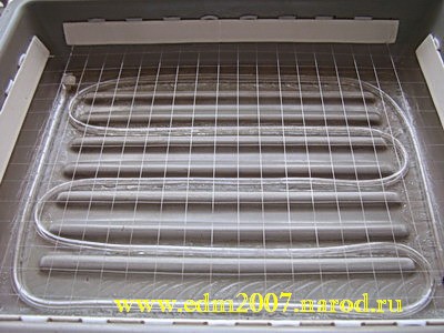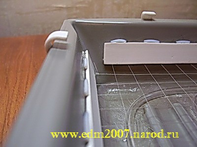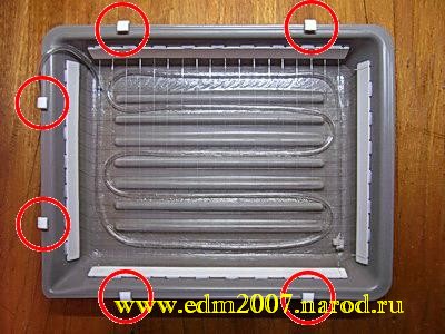 Сетка. Может быть, кому-то этот пункт покажется лишним. Дело в том, что речь в нем пойдет о сетке, натянутой на расстоянии примерно 1,5 сантиметров от дна резервуара (зазор между трубкой и заготовками плат все же необходим). Сетку делать совсем не обязательно, для обеспечения необходимого зазора можно просто в отверстия плат (лучше всего в те из них, которые предназначены для крепления платы в устройстве) вставить 4-6 спичек так, чтобы они образовывали стойки. Сделать сетку можно, опять же, несколькими способами. Мой способ заключается в следующем: из пластмассы толщиной примерно в 1 мм вырезаются полоски шириной приблизительно 1,5 сантиметра и длиной чуть меньше каждой из сторон резервуара. В результате получается две длинных и две коротких полосы:
